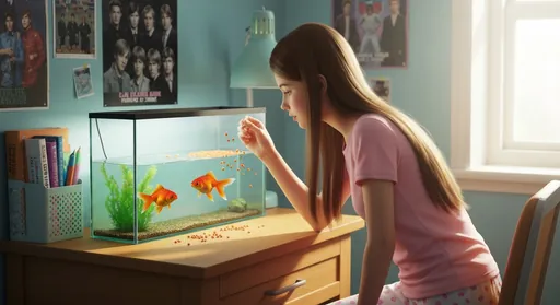Lena feeds her goldfish every morning in the aquarium on her desk.