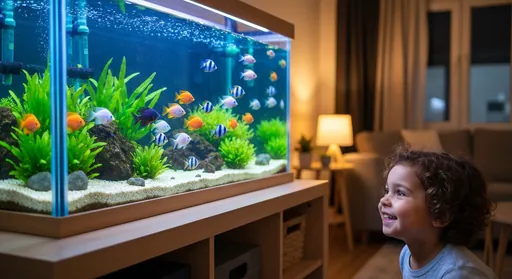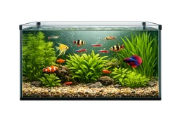 A clear glass or plastic container filled with water where people keep fish, water plants, or other small aquatic animals at home, school, or the office.
