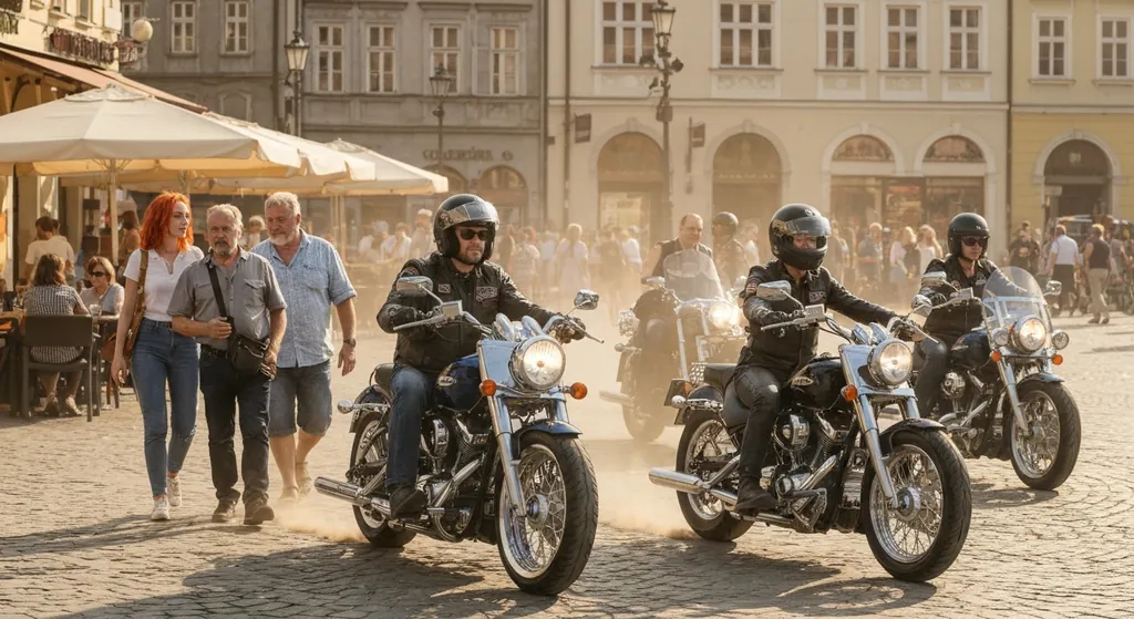 A group of loud bikers roared past the café on their shiny motorcycles.
