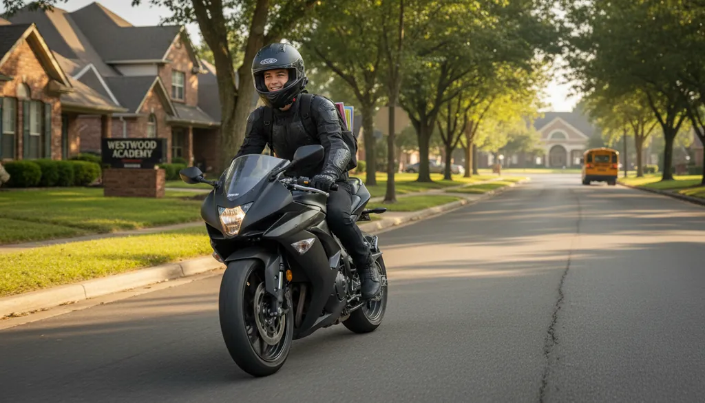 He rides his motorcycle to school every day.