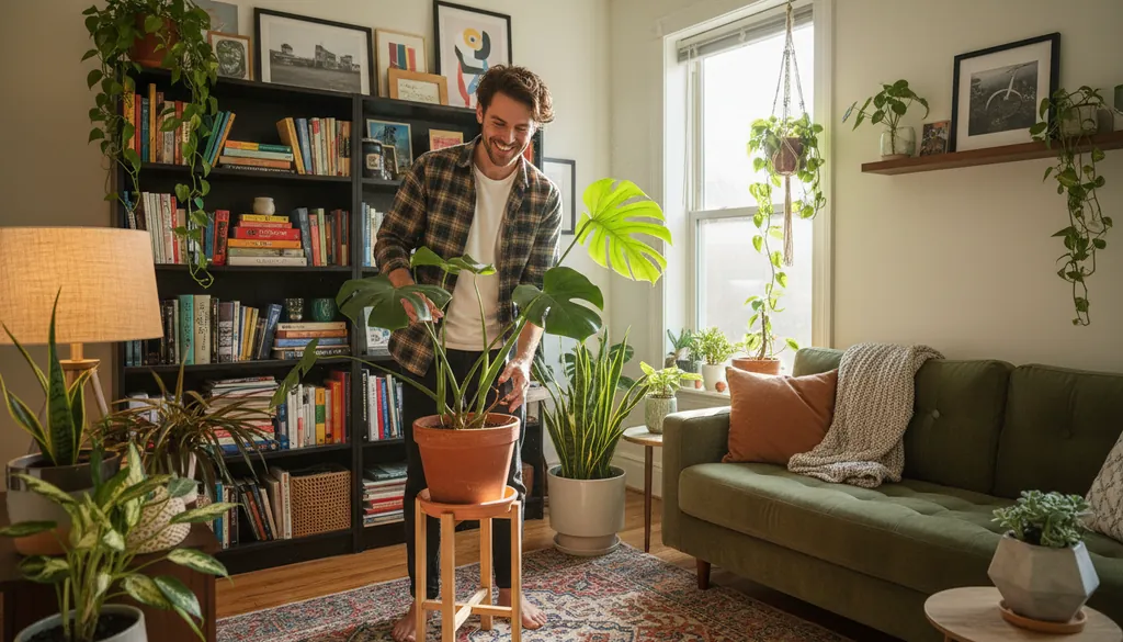 His houseplants fill every corner of the small apartment.