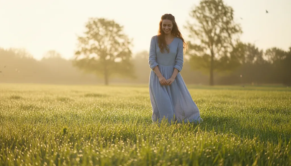 The morning dew glistens on the green grass like tiny diamonds.