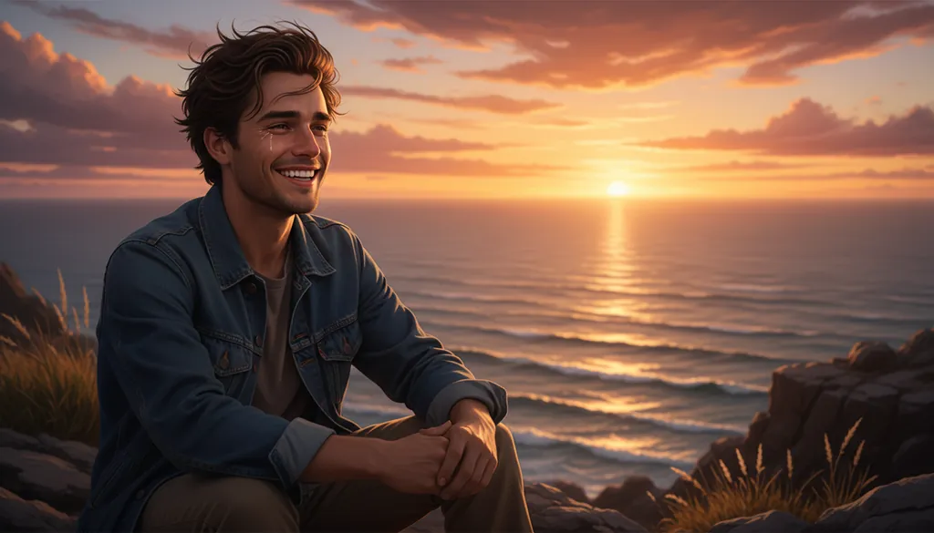 Her eyes glisten with tears as she watches the sunset.