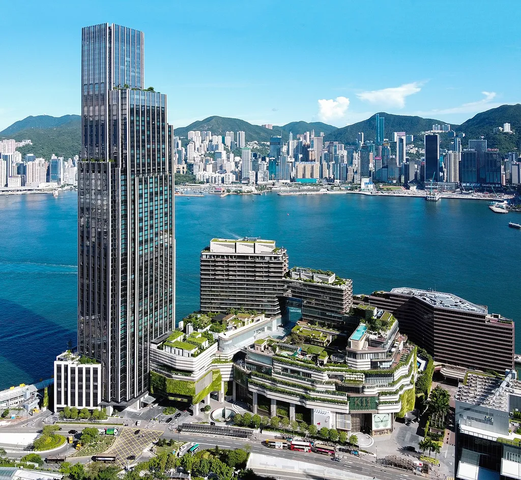 Rosewood Hong Kong opened in 2019. It is 65 floors tall and stands next to the water in Kowloon.