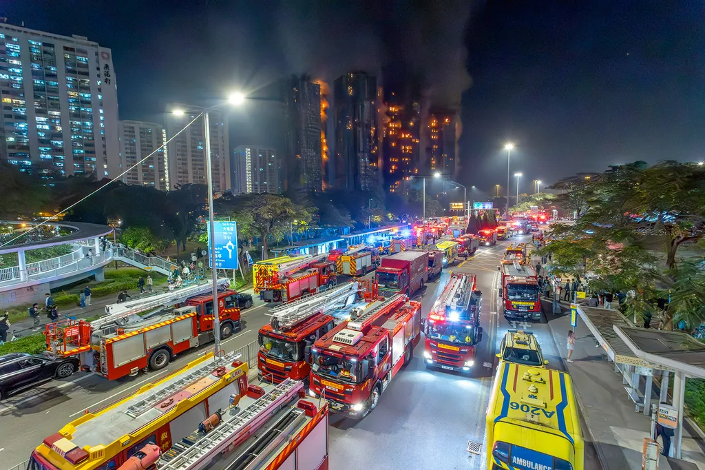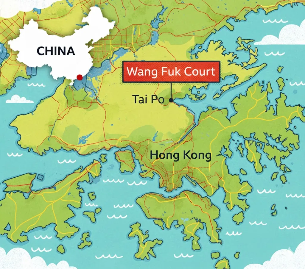 A large fire started in Hong Kong. It was at Wang Fuk Court in Tai Po district. This is a group of apartment buildings. The fire killed at least 94 people. Hundreds are missing.